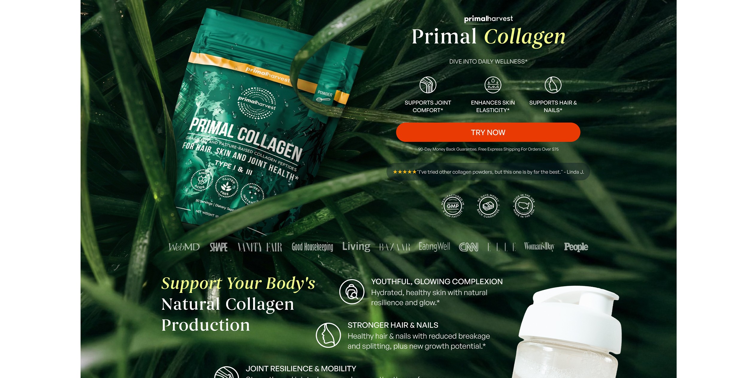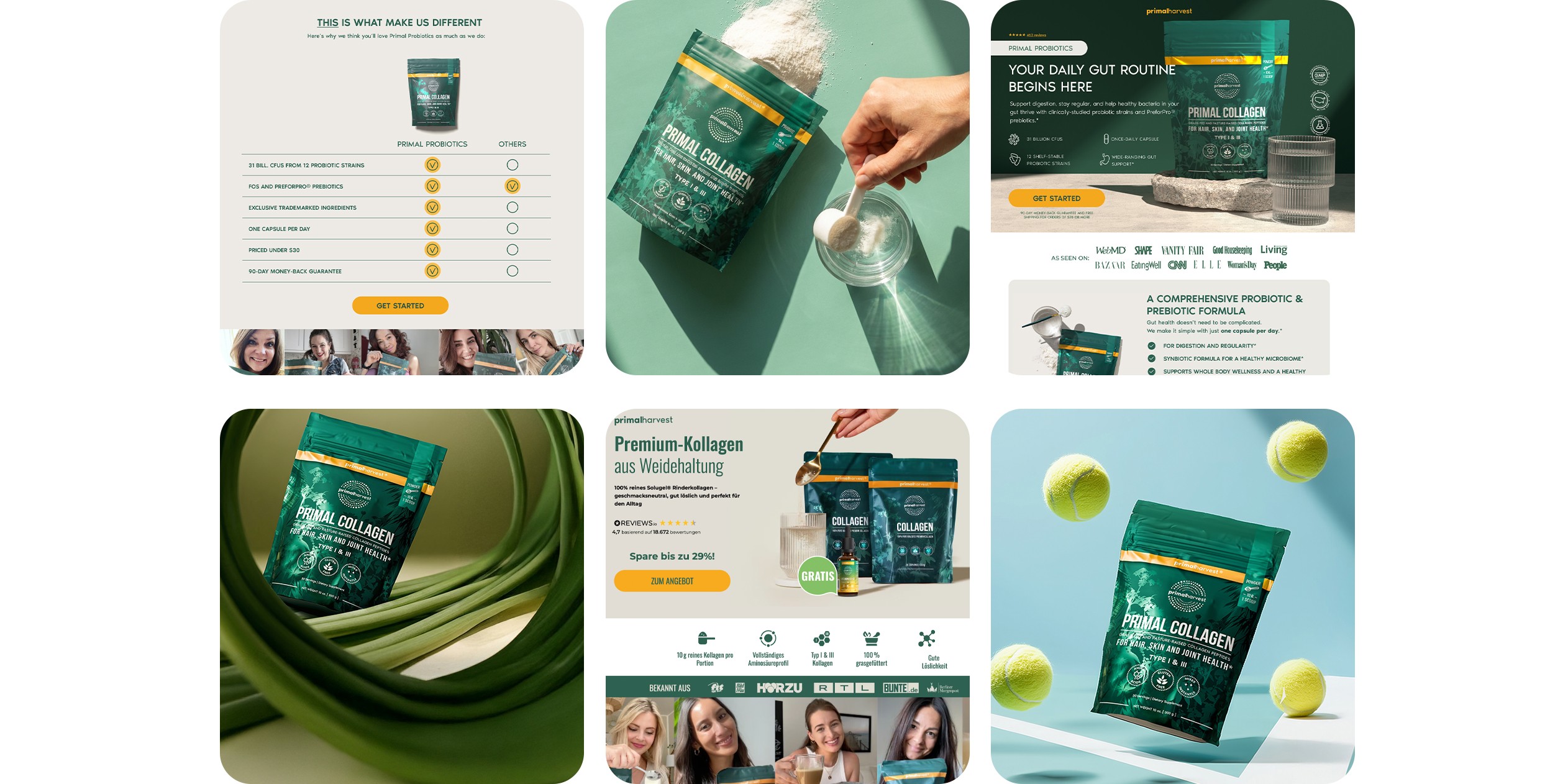 Primal Collagen is a flagship product within the Primal Harvest portfolio, representing a core part of the 40-product ecosystem I manage. My objective was to evolve the digital presence of this top-seller, focusing on the English and German markets by blending premium lifestyle aesthetics with clear, science-based information.
